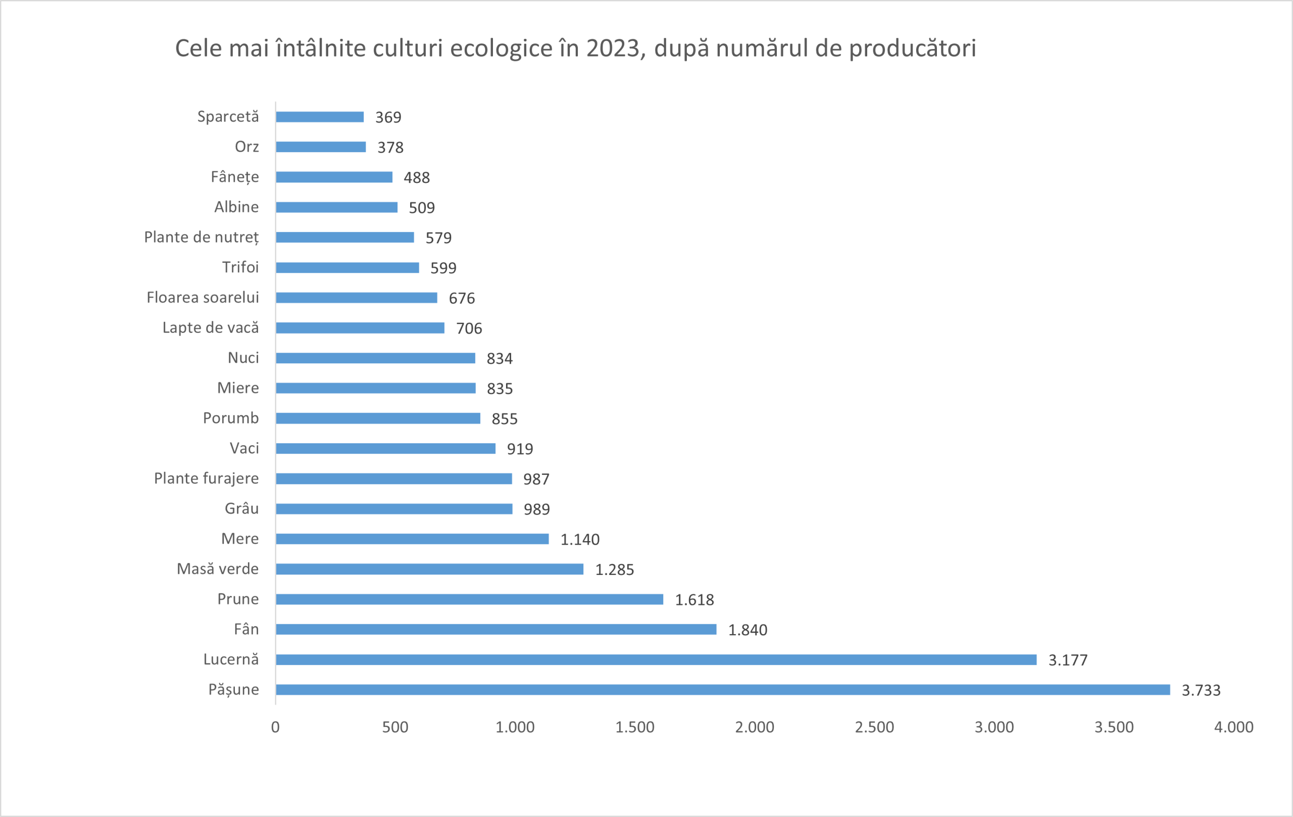 În funcție de numărul de producătari ecologici care au culturile respective pe certificatul ecologic în sistem ecologic sau în perioada de conversie la agricultura ecologică, cele mai întâlnire culturi sunt: pășunile, fânețele, plantele de nutreț, cerealele, iar dintre fructe cele mai întâlnite sunt livezile de prun, meri, nuci, peri și aluni.